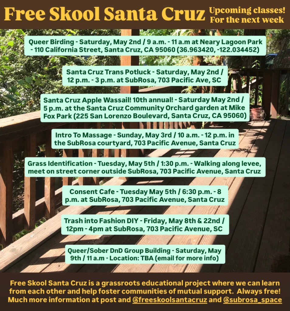 Free Skool Santa Cruz spring/summer session is happening May Day/Beltane (May 1st) to July 15th! Upcoming classes for the next week (or so). Complete class info at 2026 Free Skool Santa Cruz Spring/Summer session