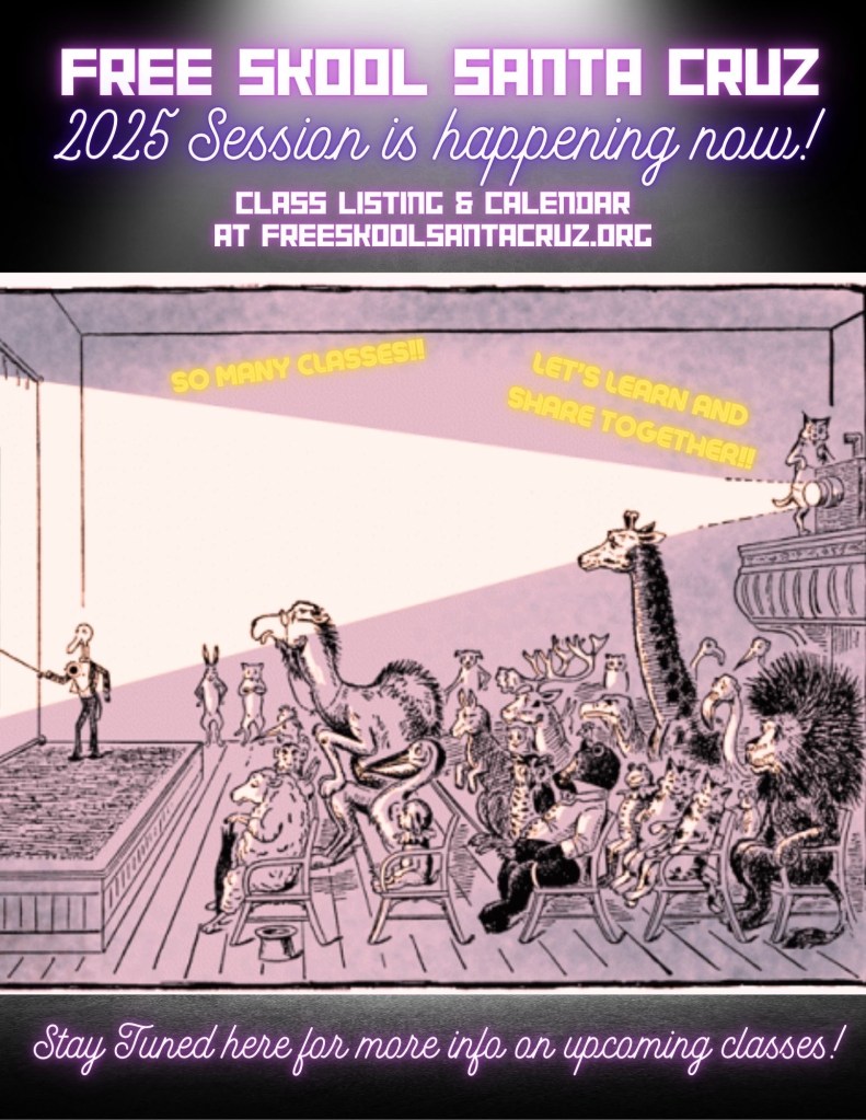 ***Members of the SubRosa collective are involved in this revived and not entirely new, not all too different version of Free Skool Santa Cruz – a project in mutual aid learning and sharing. And SubRosa/the Hub is a site of a significant amount of classes (although not all!). More info about SubRosa at http://www.subrosaproject.org/ and the Hub at http://www.santacruzhub.org/